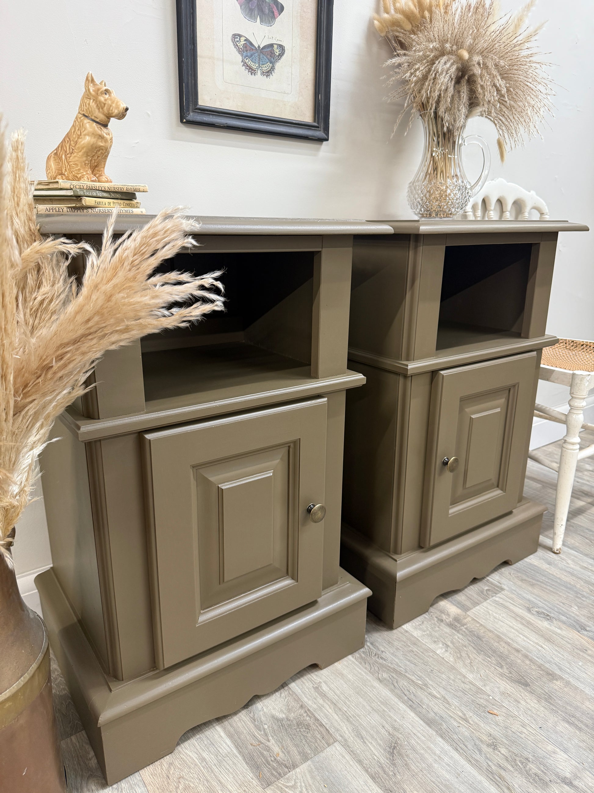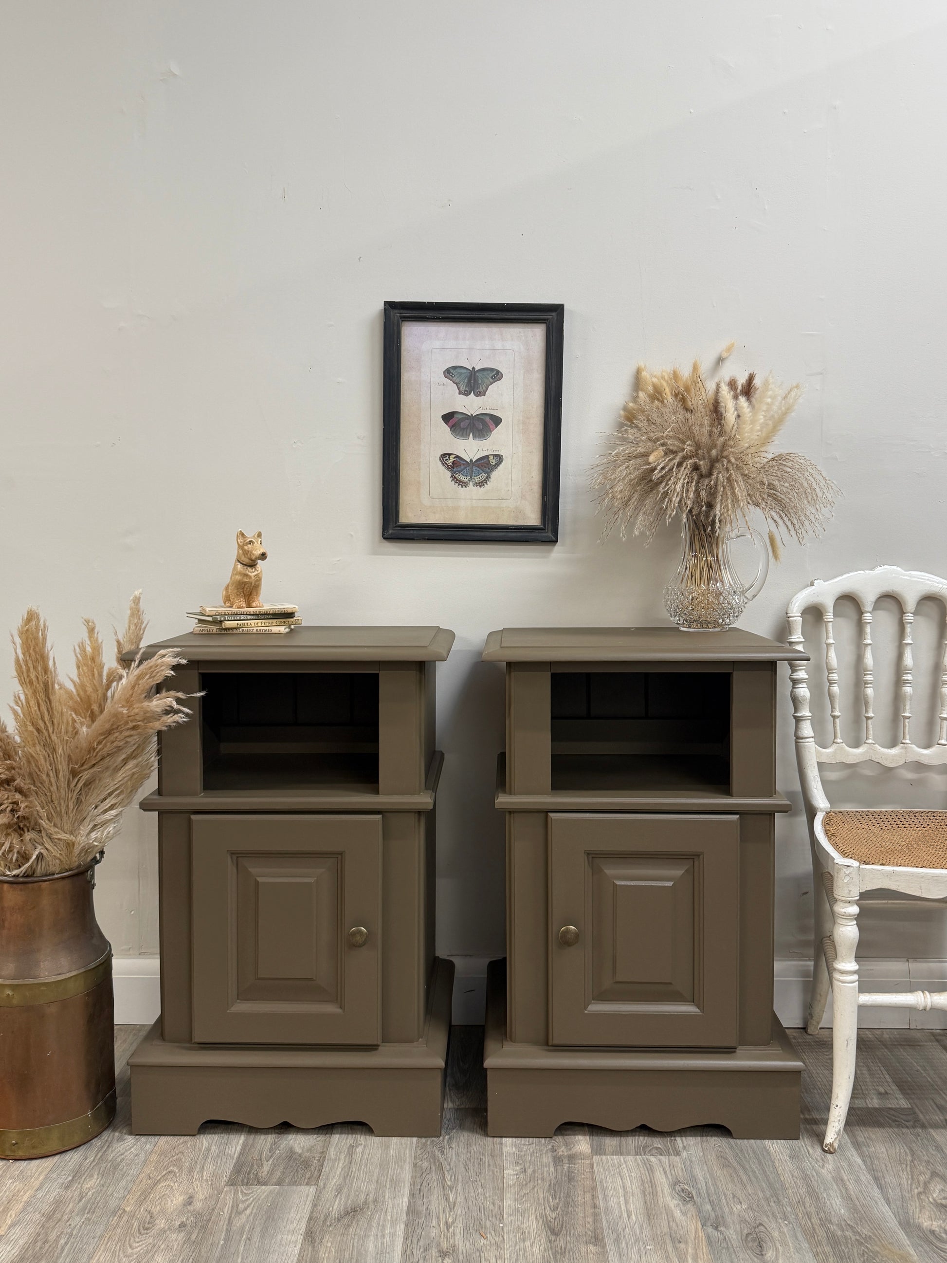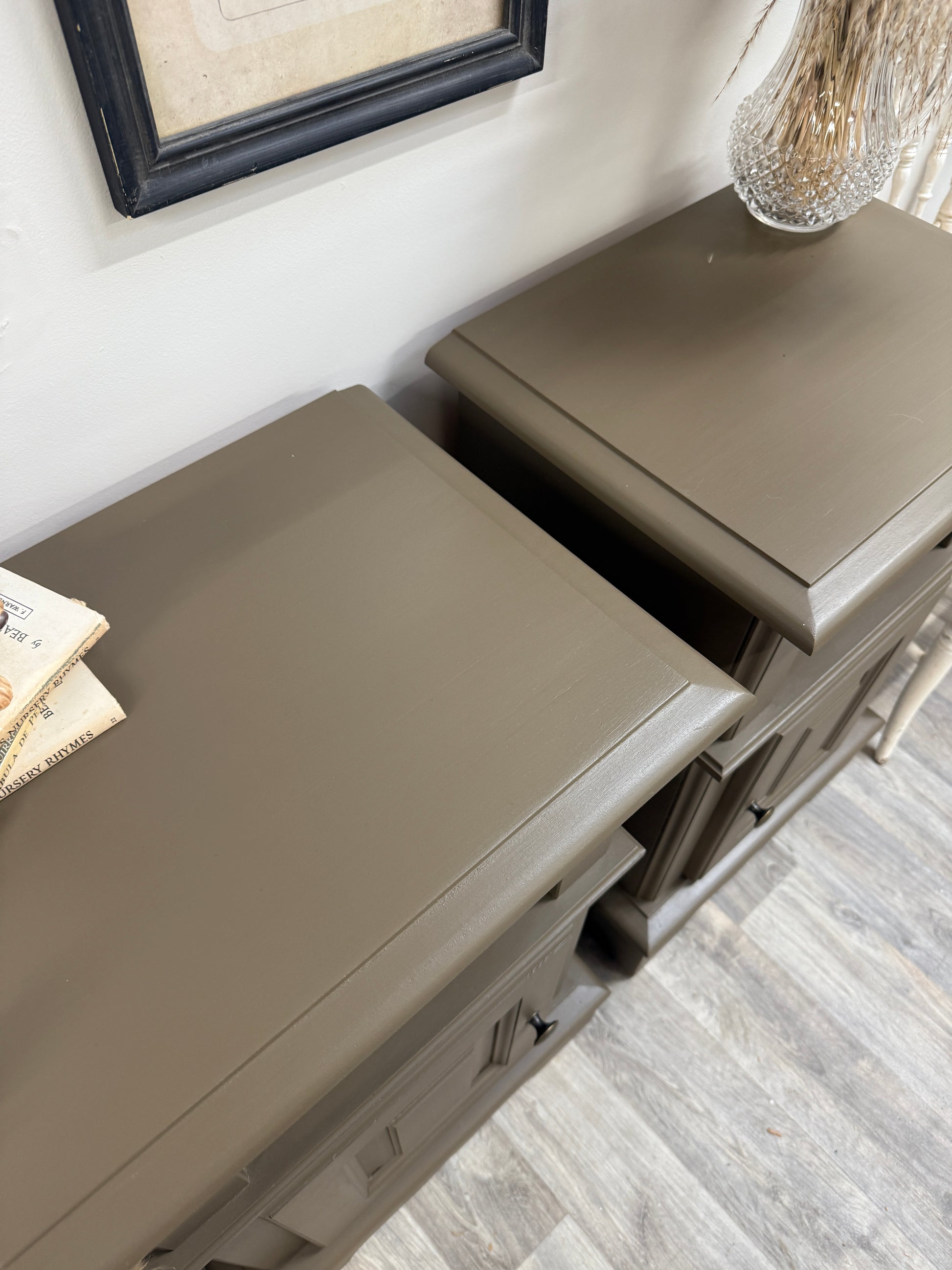 Country chic pine bedsides painted in Frenchic’s brown/green then top coated for extra protection. These are made from solid pine, great quality and sturdy pieces. These have been given a more modern makeover but still keeping that rustic look.